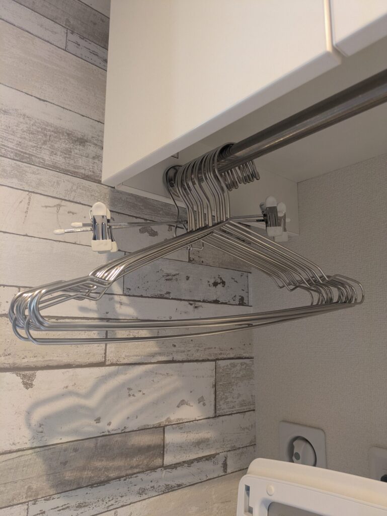 わが家では、洗濯機の上に2mの強力な突っ張り棒を設置してランドリースペースに。