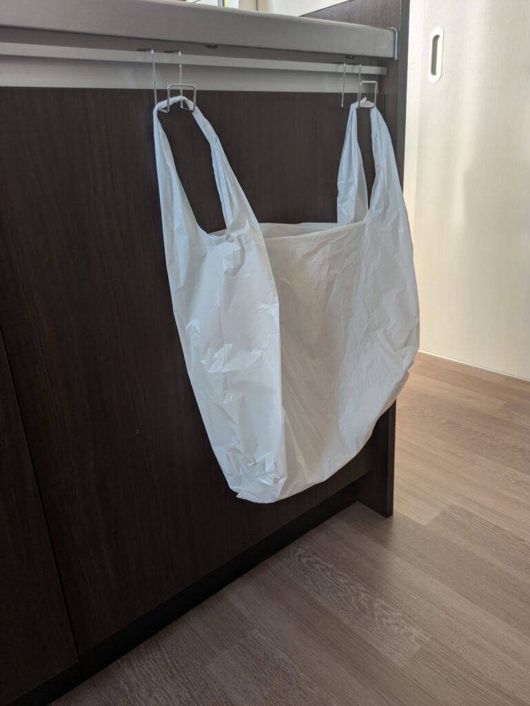 キッチンに1つだけ、レジ袋をぶら下げています。ゴミが溜まったら、ベランダの密閉ゴミ箱へ。